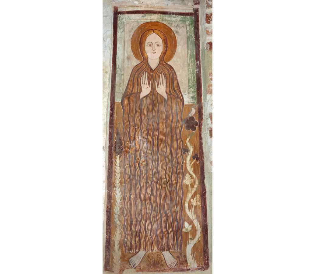 Raffigurata ai piedi della croce o come penitente in una grotta.