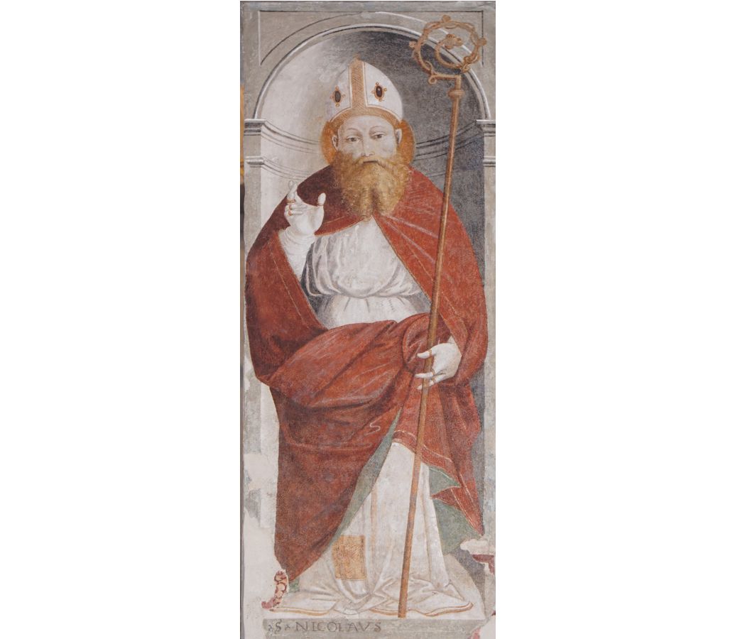 San Nicola di Myra o di Bari o Nicolao o Nicola Magno o Nicolò o Niccolò è venerato dalla Chiesa cattolica. Le loro memorie liturgiche si celebrano il 6 dicembre e 9 maggio.. È riconoscibile per gli attributi quali ancora, nave, libro, mitra, pastorale, tre sfere d'oro, tre pani e tre pietre, tre bambini che escono da una botte, con un prigioniero ai piedi.