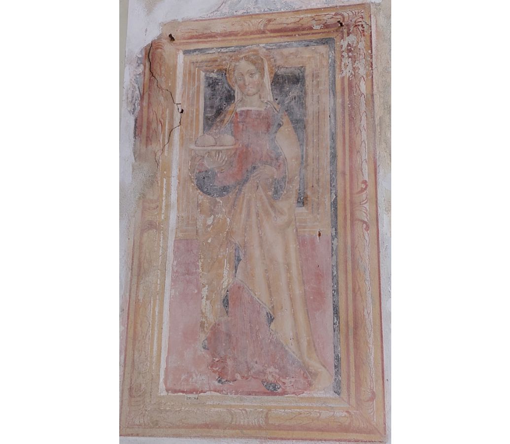 Mammelle, seno, seni in un piatto, tenaglie o cesoie (strumenti del martirio); giovane donna avvolta in ricche vesti, palma del martirio, regge un edificio in fiamme (protegge dagli incendi)..