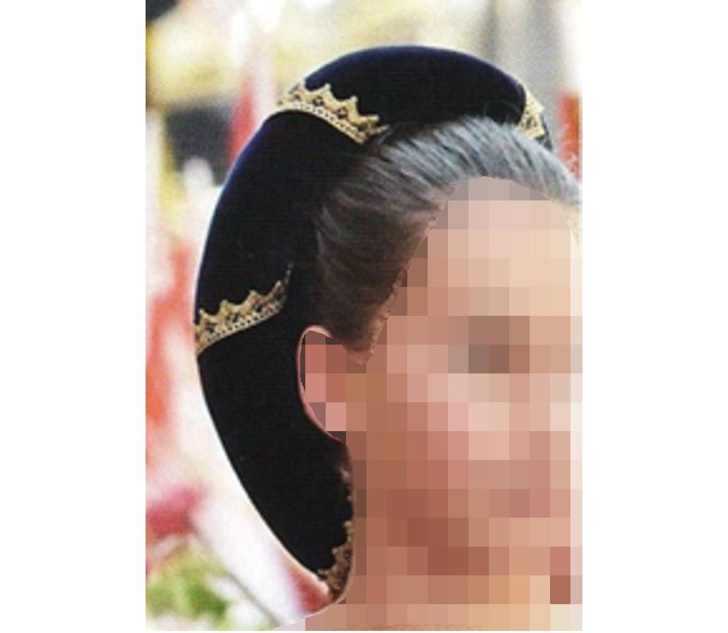 copricapo femminile tipicamente italiano: i capelli sono pettinati all’indietro e fermati da un’armatura di ferro imbottita a formare una specie di cuscino più o meno voluminoso. La chioma viene acconciata in vari modi, intrecciata con fili d’oro e di seta bianchi o gialli, con fiori, penne di fagiano, di airone o di pavone. |