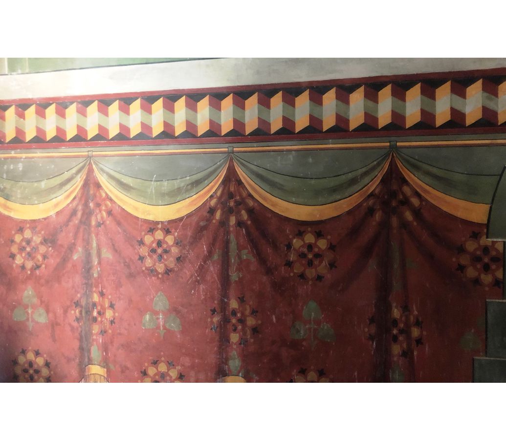 Si tratta di una finta tenda, resa con pieghe, cordoni e anelli, che imita un drappo prezioso steso a protezione e al tempo stesso a delimitazione dello spazio sacro.
